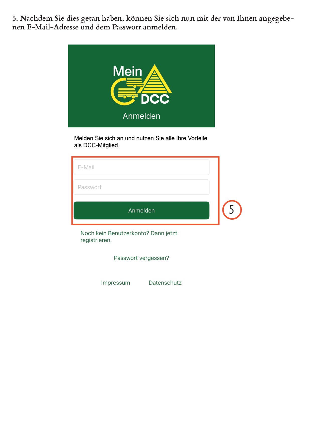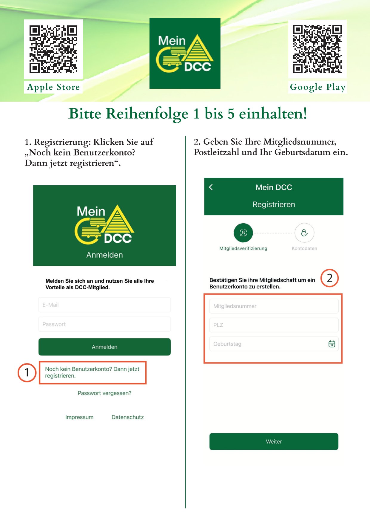 Für mobile Geräte benötigen Sie dazu zunächst die „Mein DCC“-App, die Sie in den für Ihr Gerät passenden Stores finden. Diese können Sie unter dem Stichwort „Mein DCC“ selbst suchen. Auf unserer Anleitung gibt es aber jeweils einen QR-Code, der Sie zum richtigen Store führt. Hier geht's zum Download: https://camping-club.de/downloads