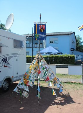 Unterstützt wurde das Team des LV von den Campingfreunden Musikantenland. Abends gab es Gegrilltes mit leckerem Kartoffelsalat und auch die Versorgung mit Getränken war gesichert. Nach der Eröffnung durch den LV Vorsitzenden Bernd Dietz begrüßte Dieter Albert, der Präsident des DCC, mit einigen humorigen Sprüchen die angereisten Camper und gratulierte dem Landesverband zu seinem Jubiläum. Auch der Bürgermeister von Olsbrücken sowie weitere LV und OC Vorsitzende gratulierten dem LV Rheinland-Pfalz. Ob alle noch am Freitag Abend wieder in ihren Wohnwagen bzw. Wohnmobilen waren, ist nicht bekannt, die Stimmung war jedenfalls die ganzen Tage sehr gut. Nach dem Frühstück am Samstag gab es die Möglichkeit, einen kleinen Spaziergang zur unter Denkmalschutz stehenden evangelischen Kirche und zu einem örtlichen Imker zu machen, die ganz Mutigen wagten sich sogar bis an die Bienenstöcke. Danach ging es Schlag auf Schlag weiter, der im Programm angekündigte Imbiss entpuppte sich als kaltes Buffet. Anstatt Kaffee und Kuchen gab es am Nachmittag dann eine musikalische Weinprobe mit Weinen vom Gutenborner Hof in Alzey, Herbert sorgte mit seinem Schifferklavier und ein paar „Weinsprüchen“ für gute Laune. Hier schon mal ein dickes DANKE an Herbert, der das ganze Wochenende für tolle Musik sorgte, wie sollte es auch anders sein im Musikantenland.